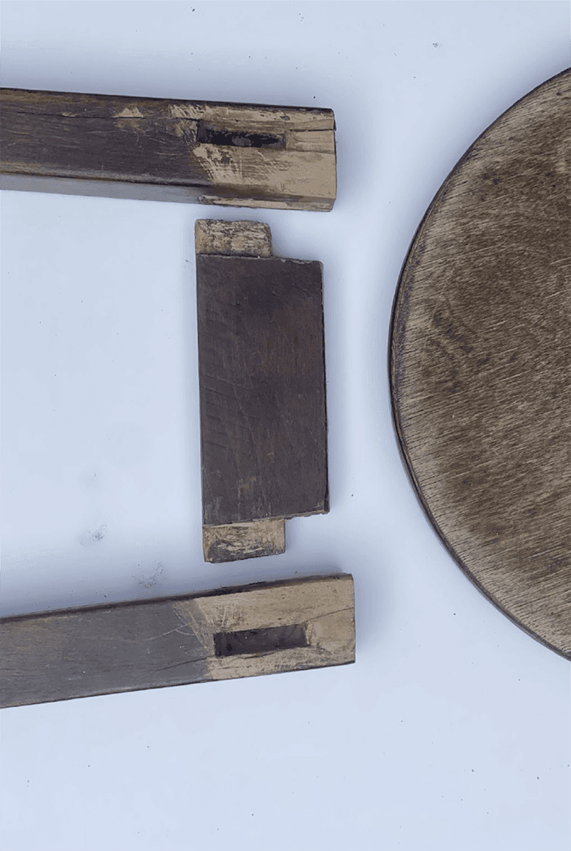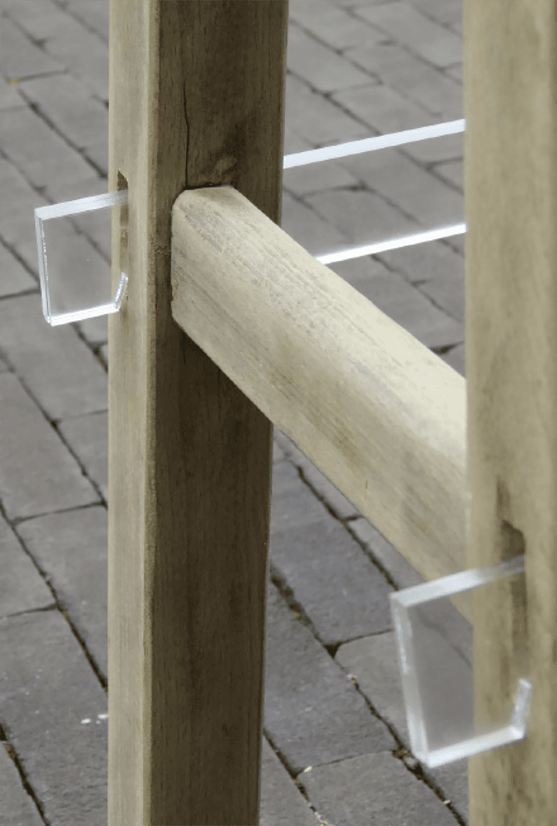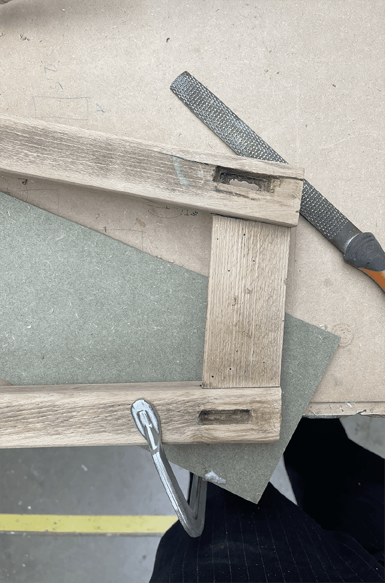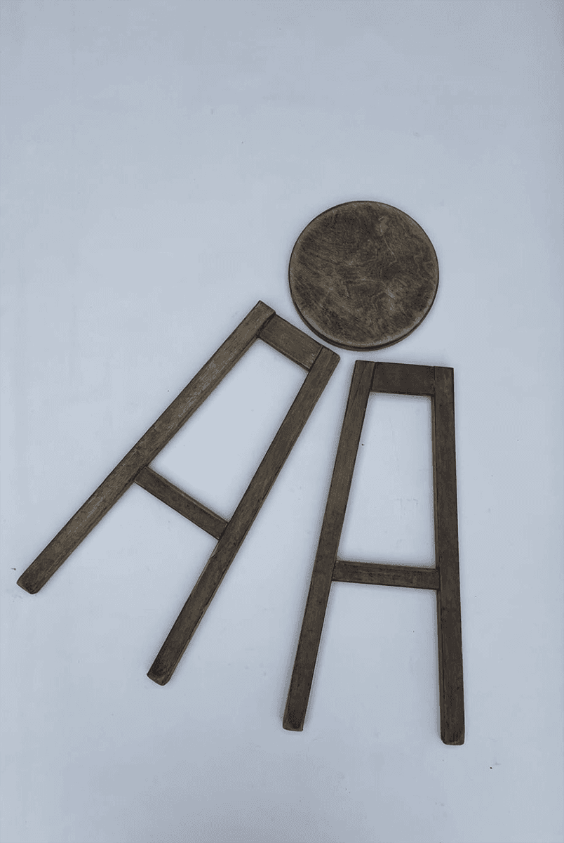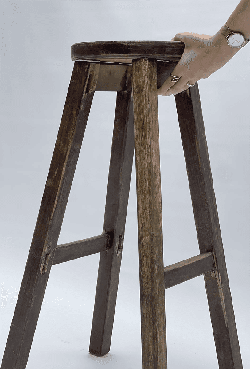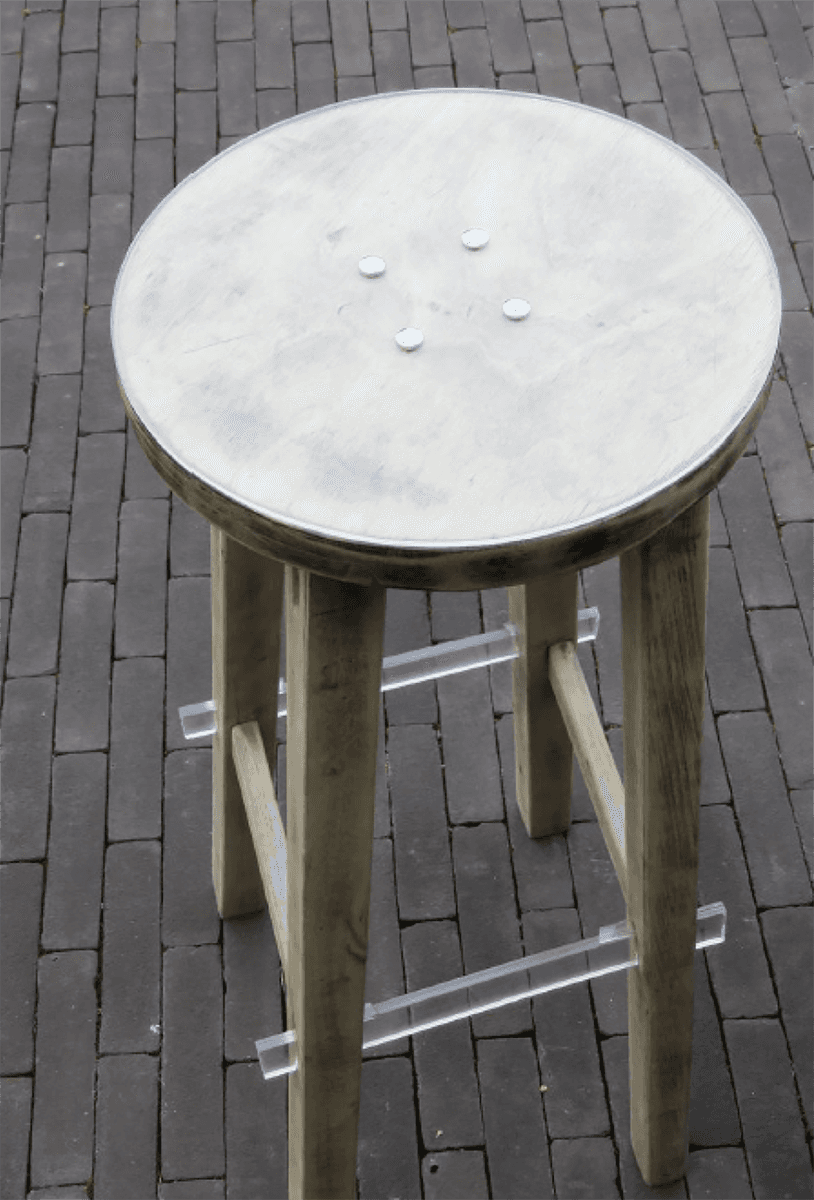 Deze houten barkruk had de eigenschap dat hij wiebelde. De pen- en gatverbindingen van de tussenbalkjes tussen de hoge poten waren het zwakke punt. Enkel verbinden met houtlijm kon het wiebelen niet voorkomen, de stoel viel zo uit elkaar. Dus werd de verbinding vervangen door draadstangen. Het zichtbaar laten van de nieuwe stukken geeft de stoel een industriële look. Tussen het zitvlak en de poten werd een gerecycleerd houten plaatje bevestigd. Bo Nevelsteen studeert de Bachelor-na-bachelor Meubelontwerp (VOMO) aan Thomas More Mechelen.